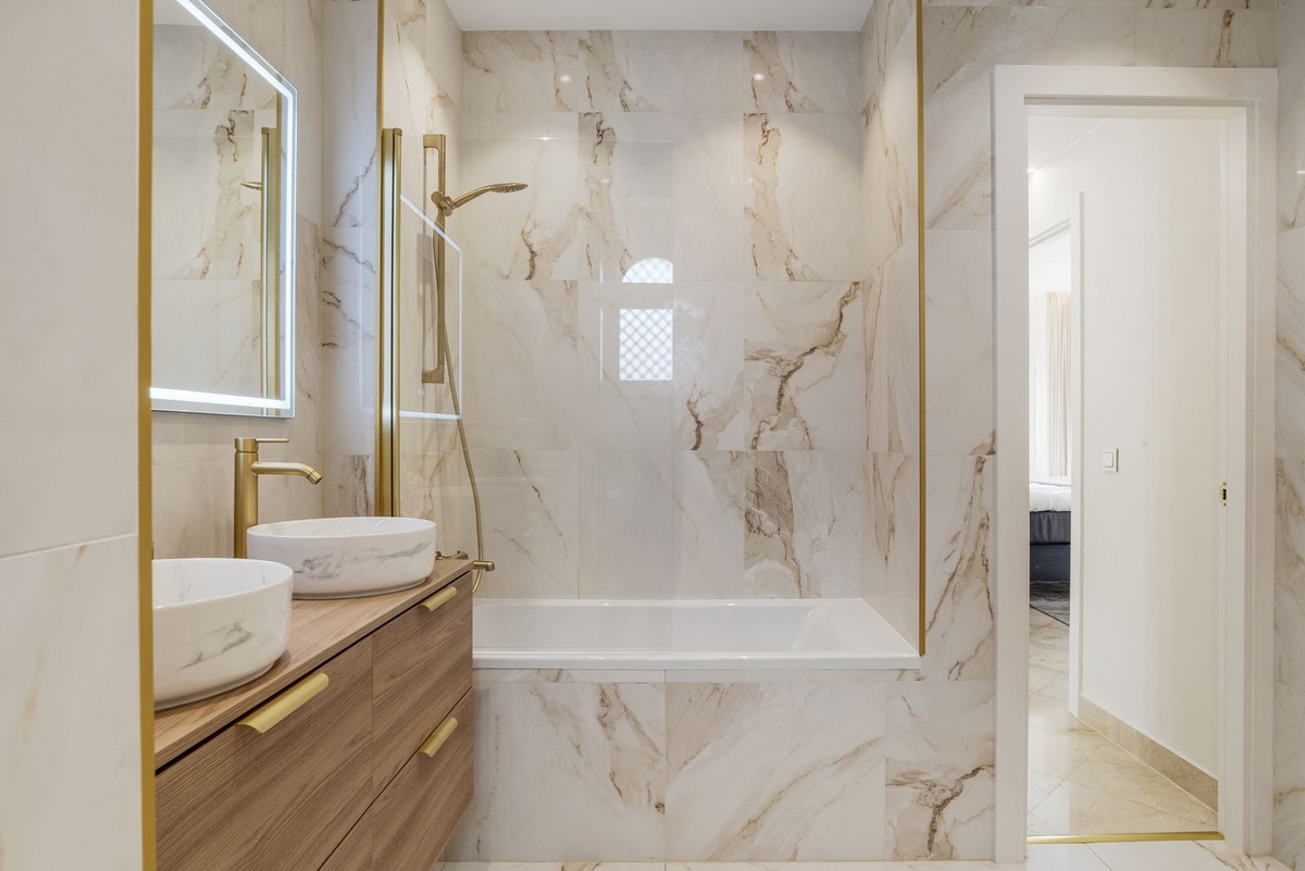 Квартира полностью меблирована, с мраморными полами, добавляющими прикосновение богатства в интерьер.