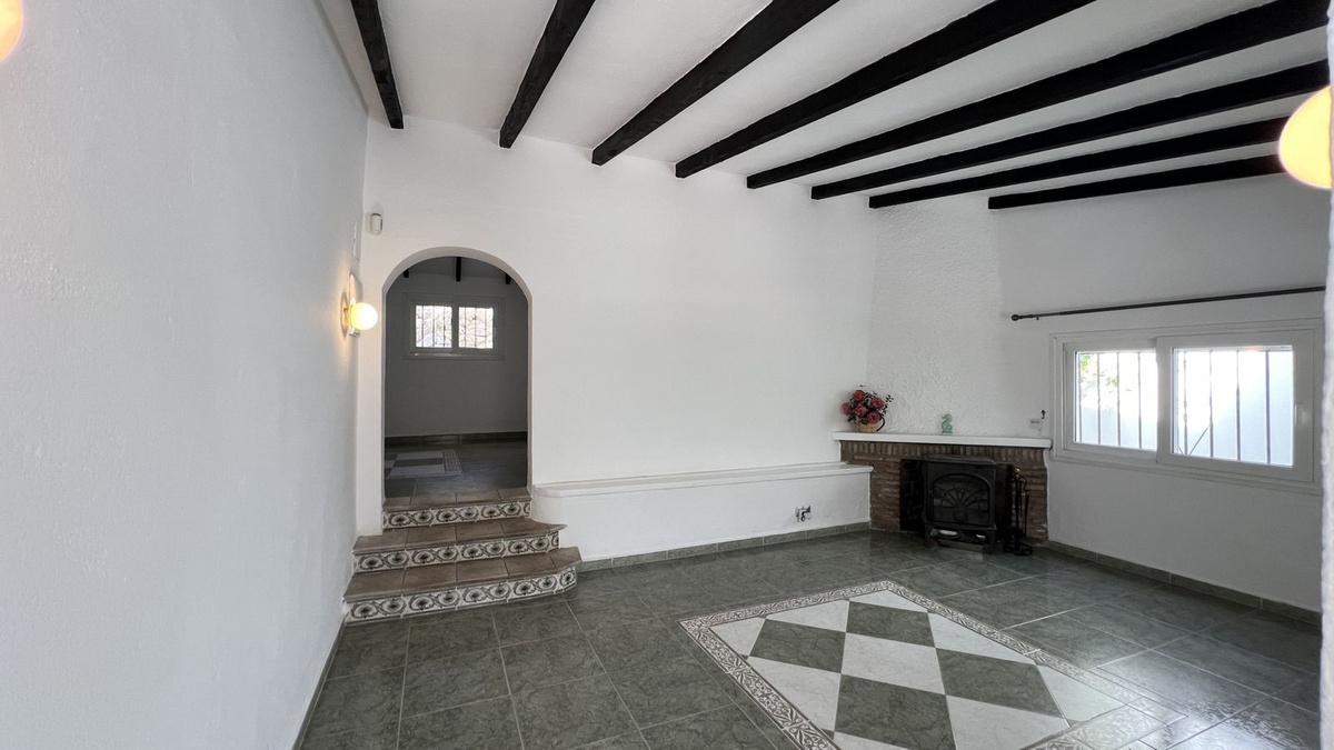 You enter through a covered porch. The main door leads to a living room that has a fabulous beamed high ceiling and a lovely wood burning stove. From here, you can go up a few stairs to a dining room with a Cathedral vaulted ceiling. The kitchen is fully fitted and also has a high vaulted ceiling. The kitchen is a separate room but can easily be made open-plan to the dining room for those who may prefer an integrated living environment.