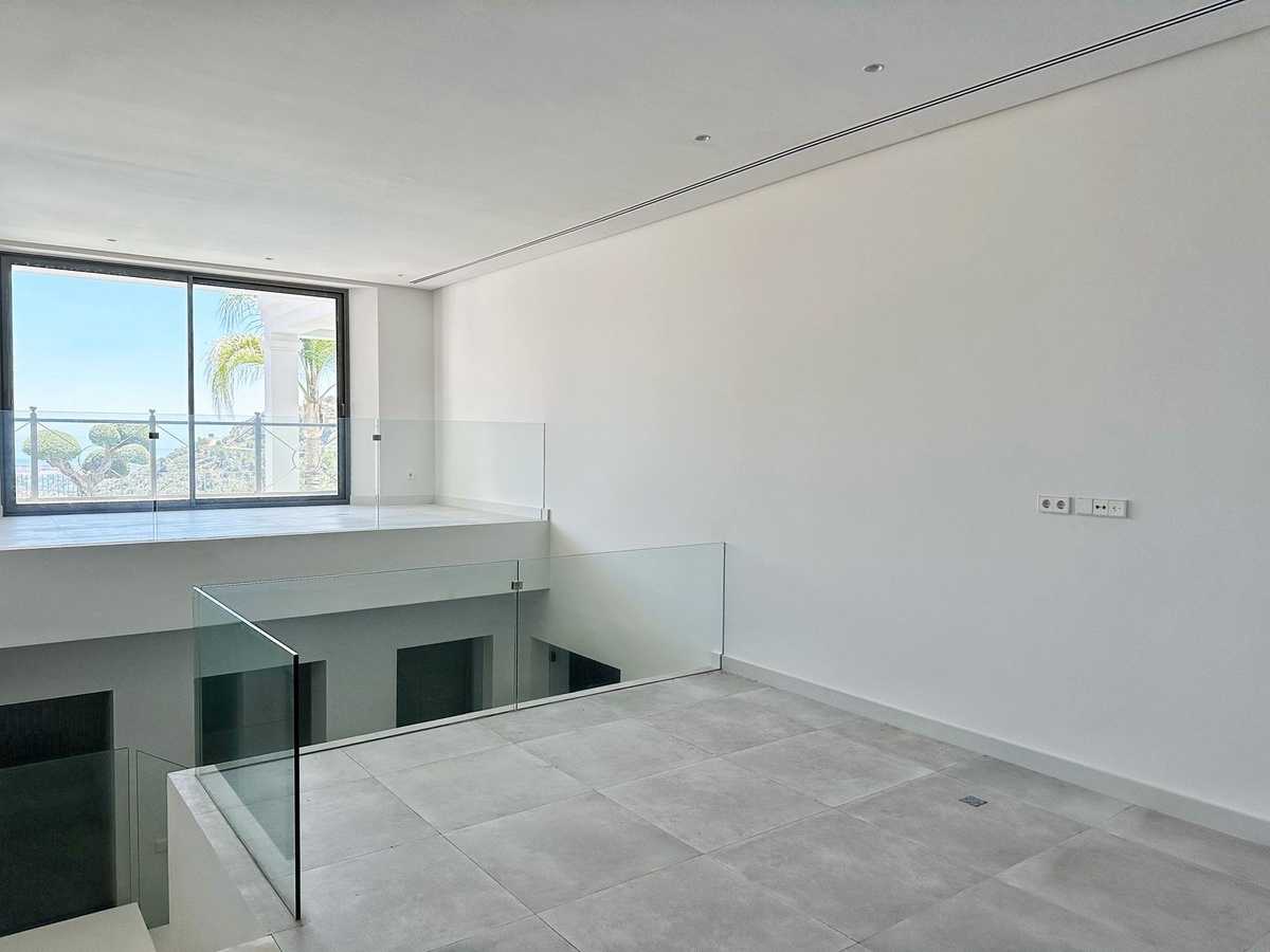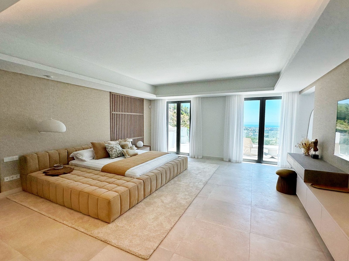 As you enter, you'll be greeted by a grand entrance hall leading to a spacious open-concept living room, an elegant dining area, and an oversized kitchen. Additionally, a stunning double-height office space provides a perfect work environment, all while enjoying unobstructed views of the El Madroñal mountains and the Mediterranean Sea.
