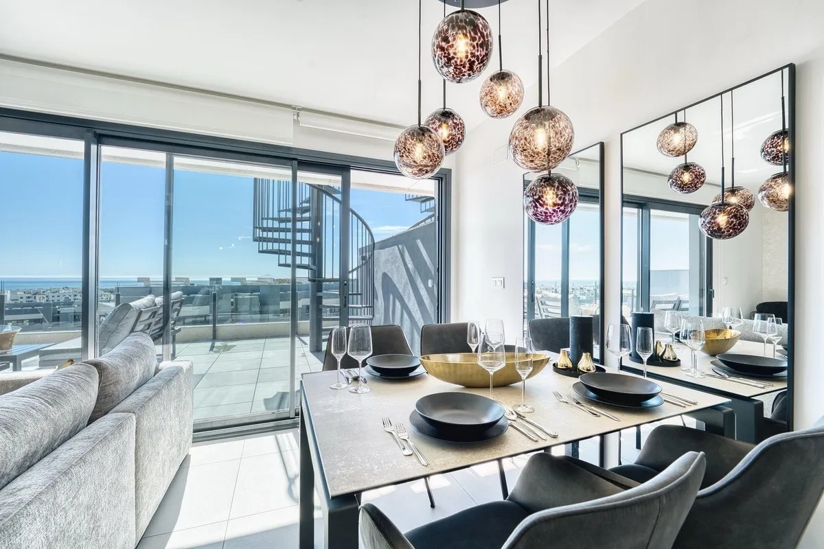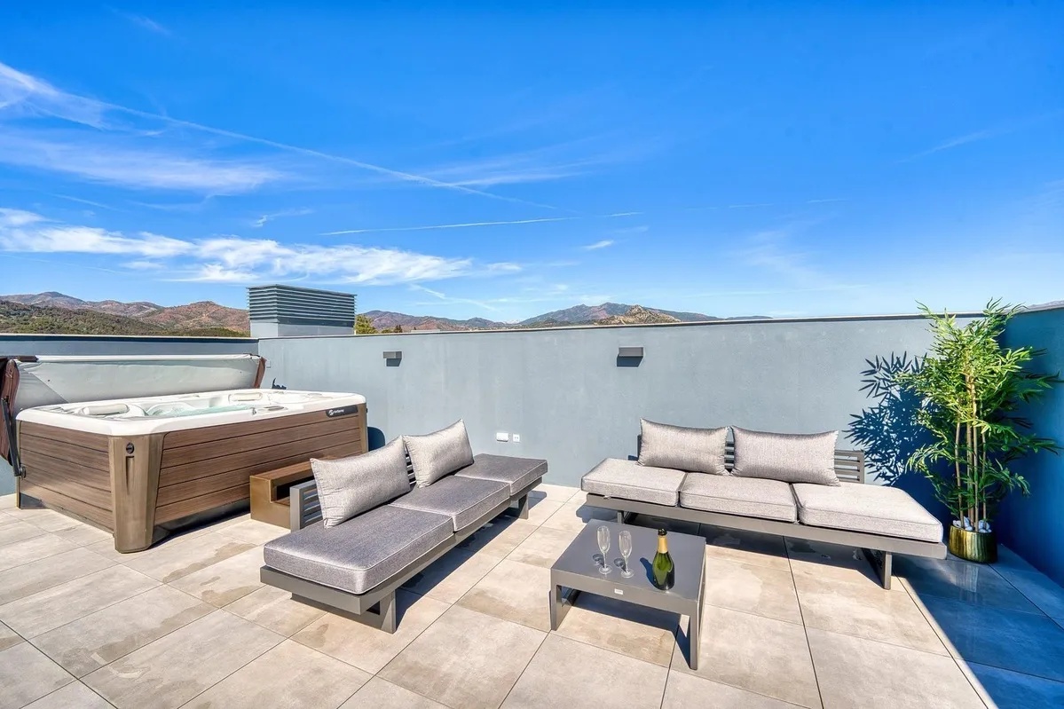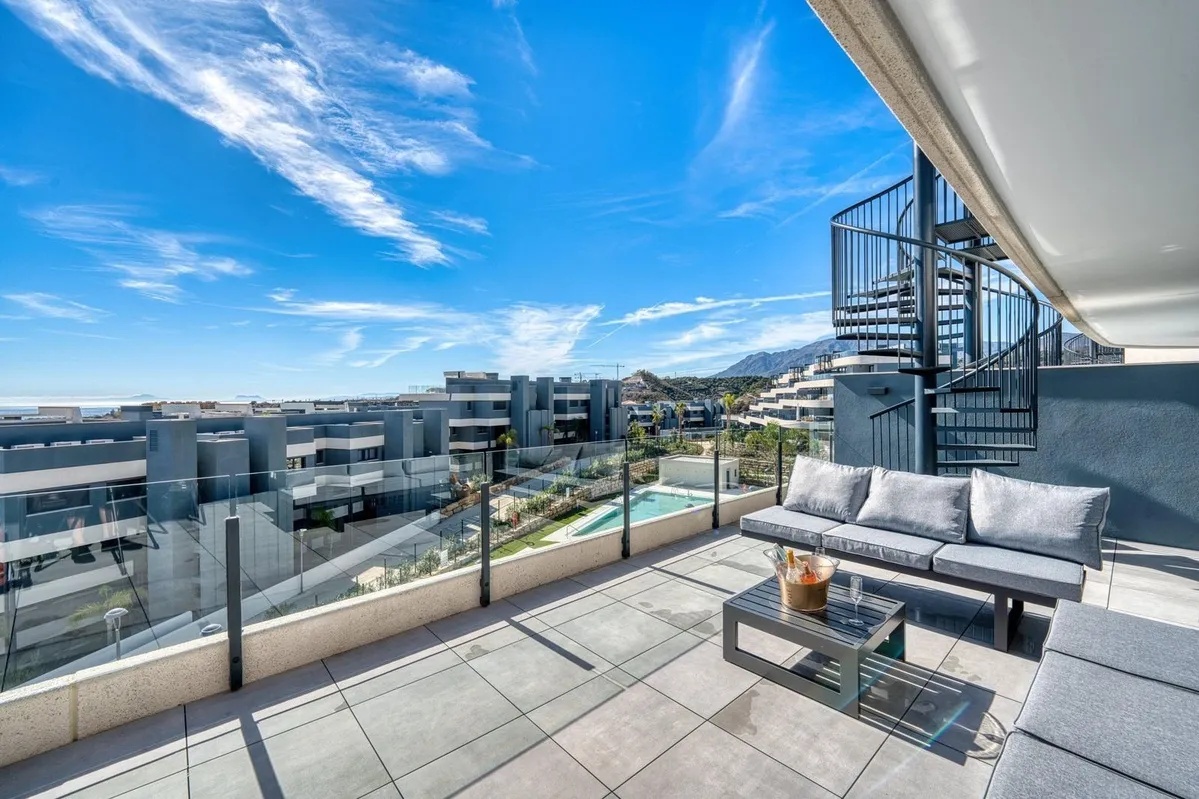 This stylish two-bedroom, two-bathroom apartment offers a spacious terrace with a dining area and lounge, plus an impressive rooftop terrace complete with lounge seating and a jacuzzi. Both terraces provide stunning, uninterrupted sea views stretching all the way to Gibraltar and North Africa.