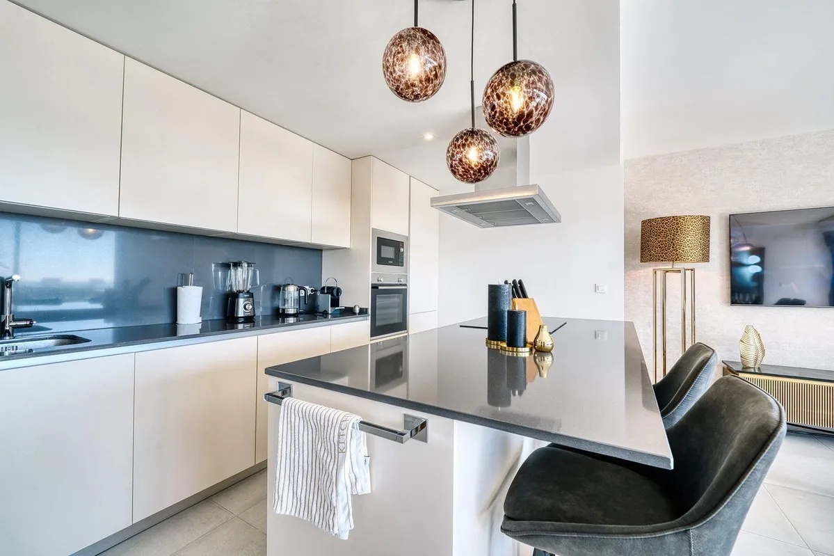 Inside, the open-plan living and dining area is connected to a contemporary kitchen and features floor-to-ceiling windows, maximizing the panoramic sea views. The rental includes a parking space in the under garage.