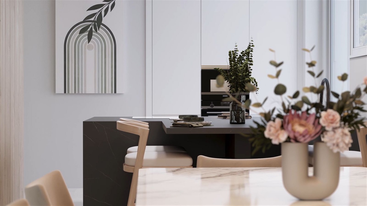 The interior design focuses on comfort and functionality, featuring spacious open areas and high-end finishes. The living room, surrounded by large windows, connects to a fully equipped gourmet kitchen—perfect for those who enjoy the culinary arts in an elegant setting. The bedrooms, all with en-suite bathrooms, stand out for their privacy, brightness, and direct access to private terraces that invite relaxation.