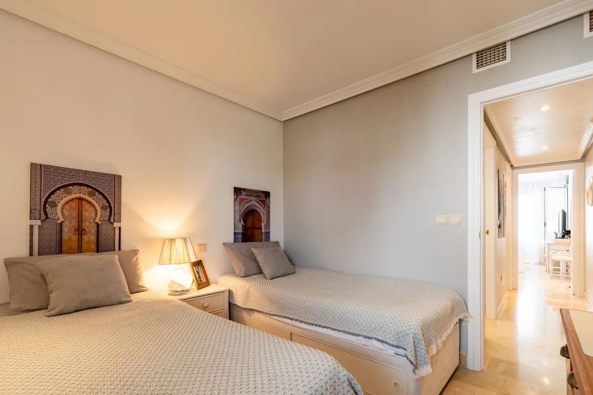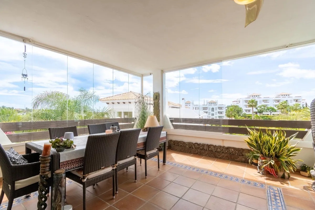 Set in a secure gated community between Puerto Banús and Estepona town, this spacious three-bedroom apartment offers the perfect blend of comfort, style, and coastal convenience. The apartment features a generous open-plan living space that connects effortlessly to three private terraces, ideal for relaxing or entertaining with views over the beautifully maintained gardens and the communal pool. The brand-new fully fitted kitchen comes with a separate utility room — stylish and practical in equal measure. The property includes two underground parking spaces and a private storage room, and is just steps from the brand-new paddle club and a 10-minute walk to the beach — ideal for an active, outdoor lifestyle. Inside, the apartment is finished to a high standard with marble floors, hot and cold air conditioning, fitted wardrobes, and fast fiber-optic internet. The gated community also offers excellent shared facilities including a gym and sauna, adding to its year-round appeal. Surrounded by golf courses, close to international schools, and with easy access to transport links, this home delivers both tranquillity and convenience. With beautiful sea and mountain views, and in immaculate condition throughout, this is a smart choice whether you’re looking for a permanent home or a stylish lock-up-and-leave retreat on the Costa del Sol.