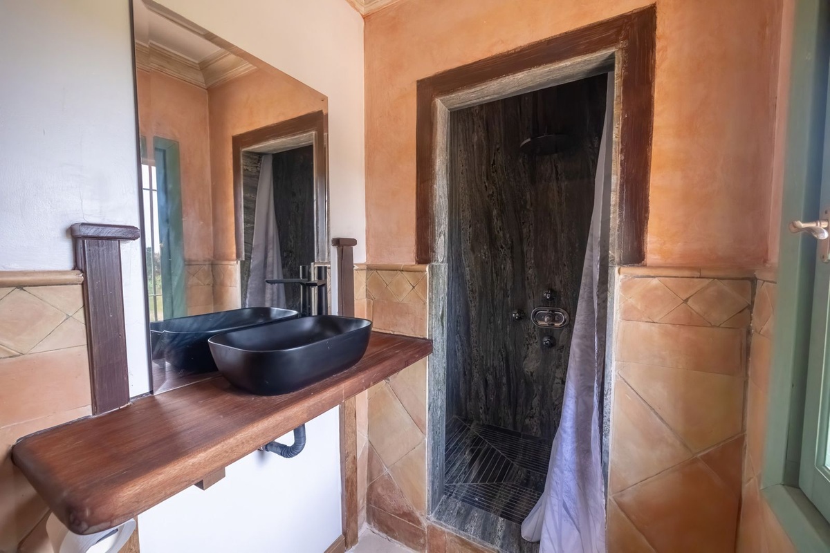 The villa is fully furnished and features a large living room with a fireplace, creating a warm and comfortable atmosphere. Large sliding doors open onto a private covered terrace with views of the mountains and landscaped garden, offering a perfect space for relaxing or dining outdoors.