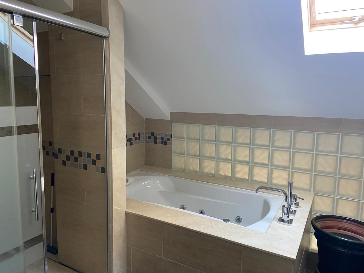 * Renovated bathroom with whirlpool bathtub, separate shower, and natural light