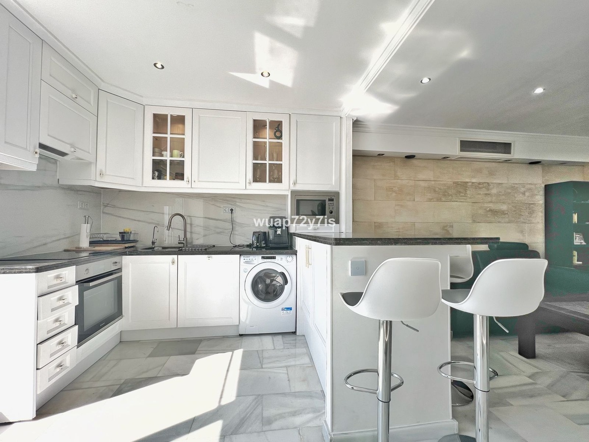 Этот прекрасно отремонтированный пентхаус расположен в популярной урбанизации Sun Gardens на востоке Эстепоны. В сообществе есть бассейн и разрешена краткосрочная аренда, что делает его отличной инвестицией, а также прекрасным домом. При входе в дом вас встречает прихожая с выходом в гостевой туалет. Справа находится светлая гостиная открытой планировки с полностью оборудованной кухней. Из гостиной вы выходите на просторную террасу с зоной барбекю - идеальное место для обедов и развлечений. С этой террасы лестница ведет на частную террасу на крыше, где можно расслабиться в джакузи, воспользоваться дополнительным местом для барбекю и полюбоваться захватывающим панорамным видом на гору Ла-Конча и Средиземное море.