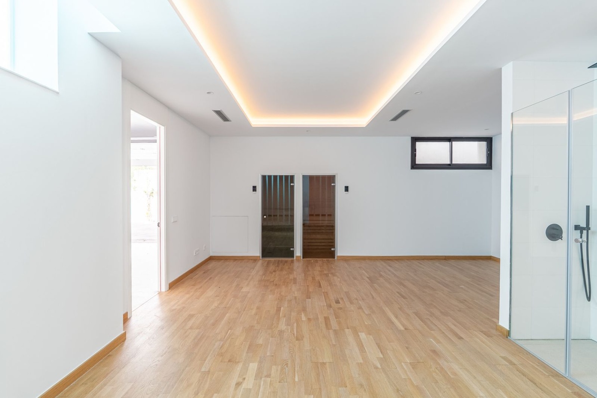 The lower level is dedicated to leisure and wellness, featuring a climate-controlled wine cellar, fitness area, sauna, hammam, and pre-installed home cinema, along with laundry and storage rooms. The garage accommodates several cars and includes an electric vehicle charging station.