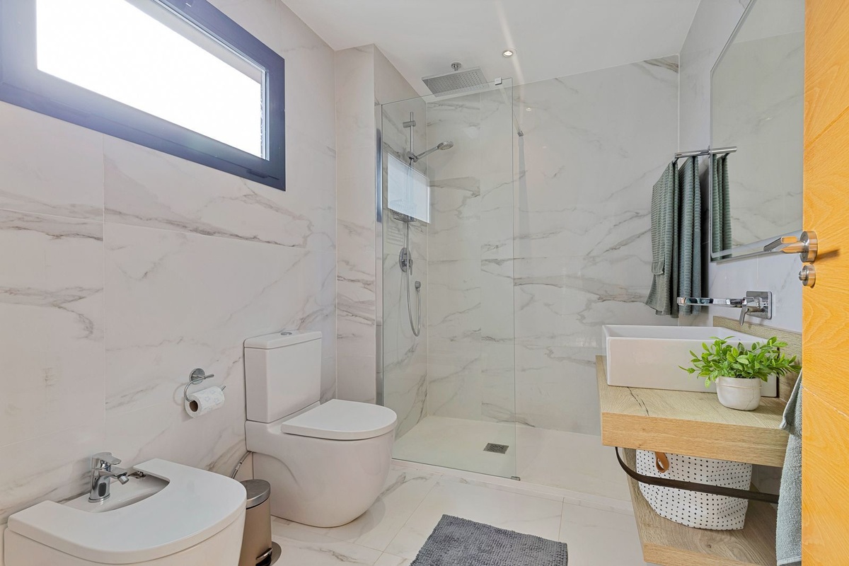 Upstairs, the master bedroom awaits with its own balcony and stunning sea views. It features a spacious walk-in closet and a private bathroom, enhancing both comfort and quality in daily living. On the same floor, there are two additional bedrooms and another full bathroom.