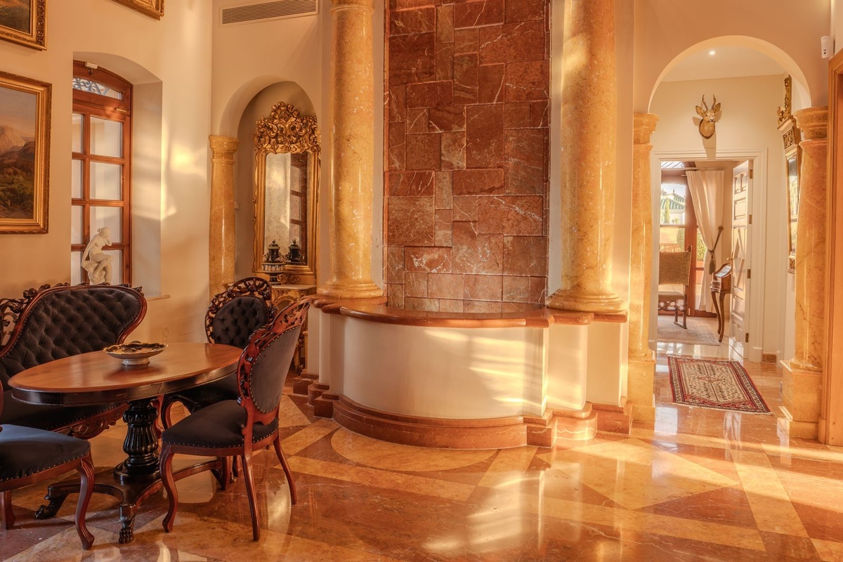 Gracefully positioned in Nueva Andalucía- on one of Marbella’s most coveted addresses, this west-facing landmark residence sits on a 3,400 m² plot and captivates with its grand, refined appearance. Its 1,727 m² of interiors showcase soaring double-height ceilings, intricate woodwork, and hand-finished marble, creating spaces of enduring beauty and sophisticated character.
