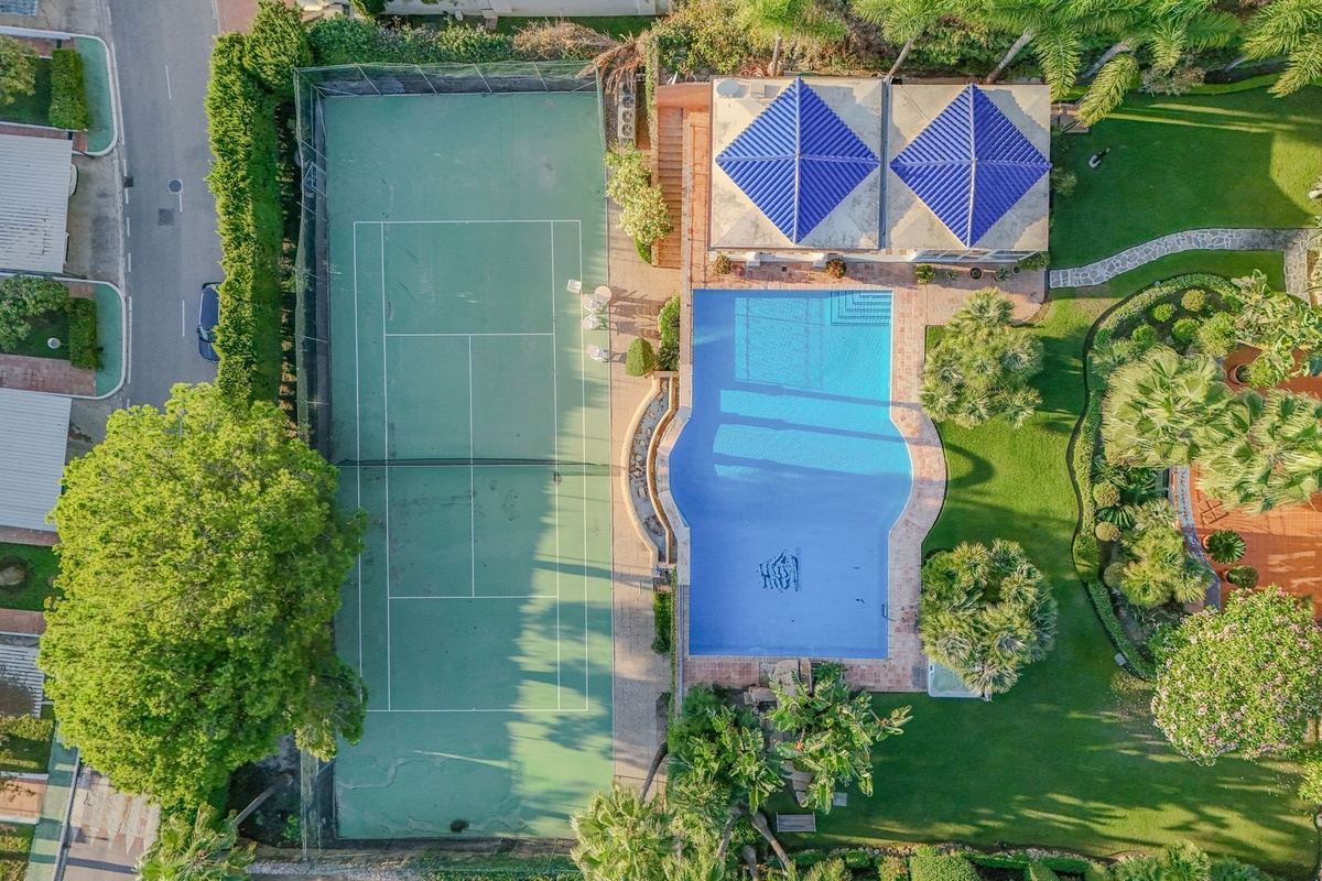 Living areas flow seamlessly into the lush gardens, complemented by more than 480 m² of terraces that create a perfect indoor-outdoor lifestyle. The grounds include a large swimming pool and a private tennis court, enhancing the estate’s resort-style environment under the Mediterranean sun. A fully equipped outdoor kitchen adds convenience for dining with family and friends.