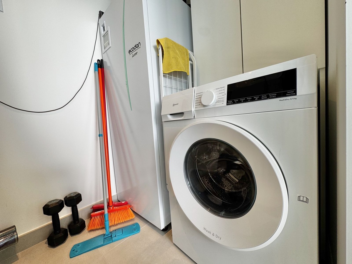 The bright open-plan living area blends seamlessly with the main terrace, creating a perfect space for alfresco dining, relaxing in the sun, or enjoying the scenery. The apartment features two bedrooms, including a master with a dressing closet, two modern bathrooms with underfloor heating, a fully equipped open kitchen with Neff appliances, a laundry room, and an entrance closet. Comfort and convenience are enhanced by electric awnings inside the apartment and on the main terrace. The apartment is fully furnished and ready to move in.