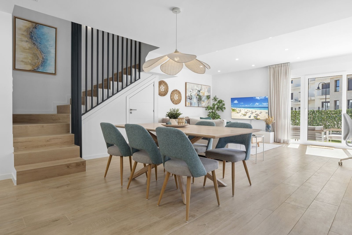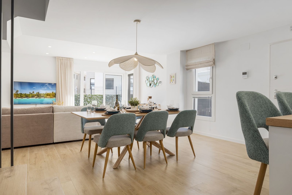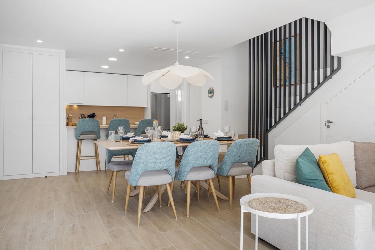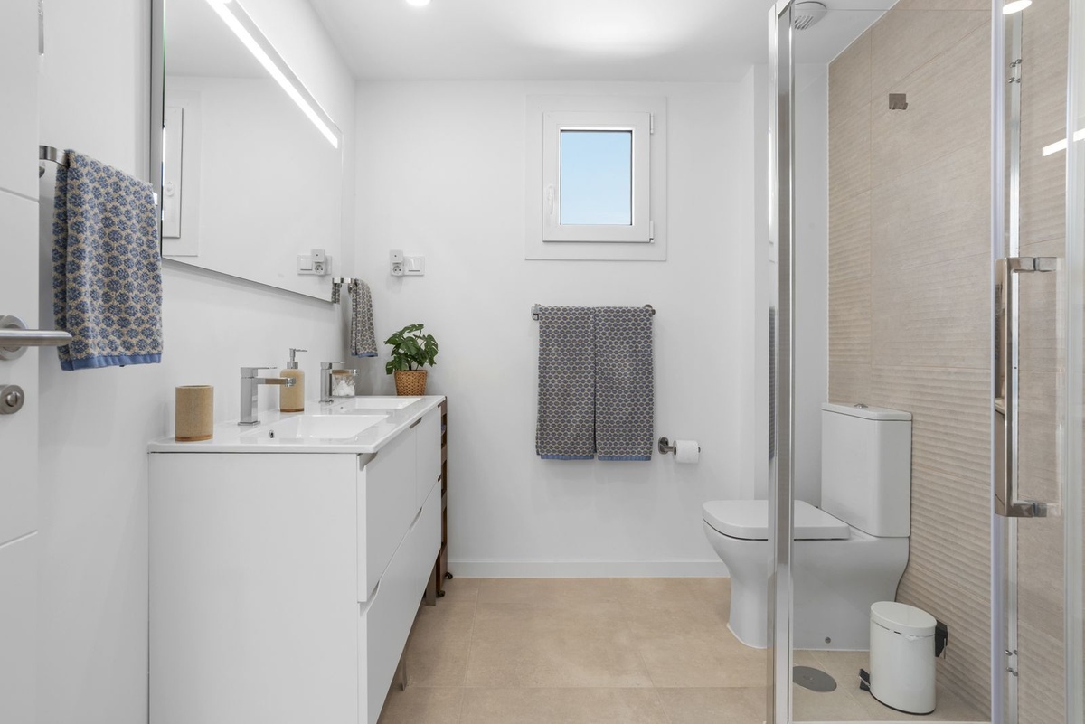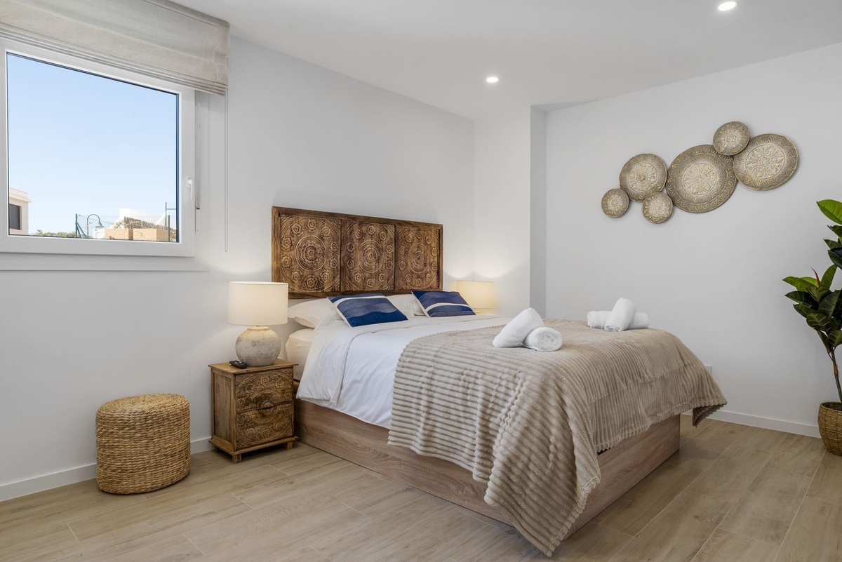 Enter the spacious open plan living area with kitchen, dining area, living room and access to the patio and private garden. The kitchen is fully equipped with all appliances, a separate utility area with washer and tumble dryer and there is a downstairs wc. Family time is spent together in this fully connected space, around the breakfast bar and dining table or on the large comfy sofa area with big screen TV or playing games, this is a welcoming and comfy space to enjoy time well spent with family or friends. Upstairs we have 3 bedrooms, the master suite with ensuite and private sea view terrace, a further spacious double bedroom and a comfortable twin room shares the family bathroom with walk in shower. All the bedrooms are light and bright with the modern coastal vibe that runs through the house