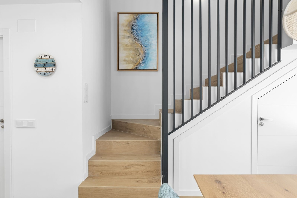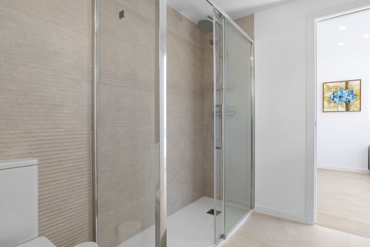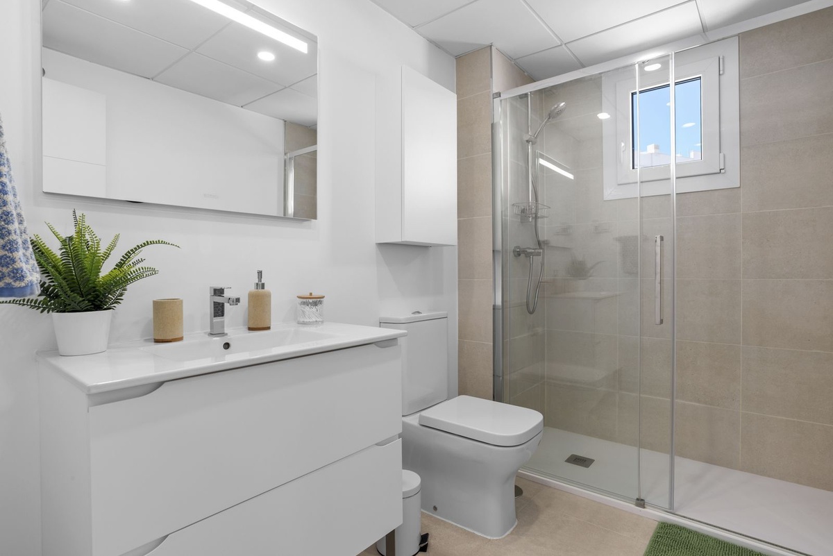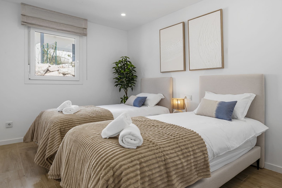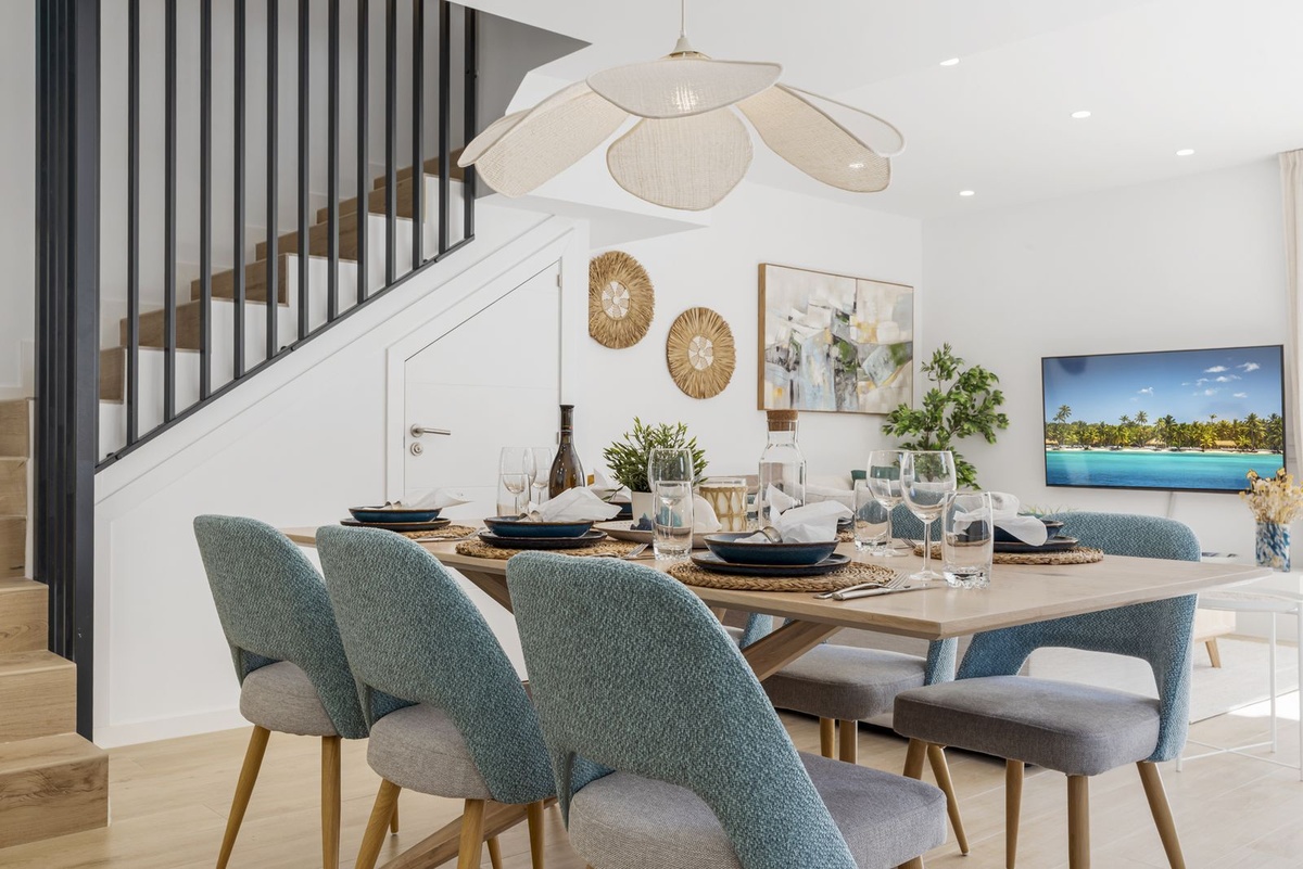 Enter the spacious open plan living area with kitchen, dining area, living room and access to the patio and private garden. The kitchen is fully equipped with all appliances, a separate utility area with washer and tumble dryer and there is a downstairs wc. Family time is spent together in this fully connected space, around the breakfast bar and dining table or on the large comfy sofa area with big screen TV or playing games, this is a welcoming and comfy space to enjoy time well spent with family or friends. Upstairs we have 3 bedrooms, the master suite with ensuite and private sea view terrace, a further spacious double bedroom and a comfortable twin room shares the family bathroom with walk in shower. All the bedrooms are light and bright with the modern coastal vibe that runs through the house