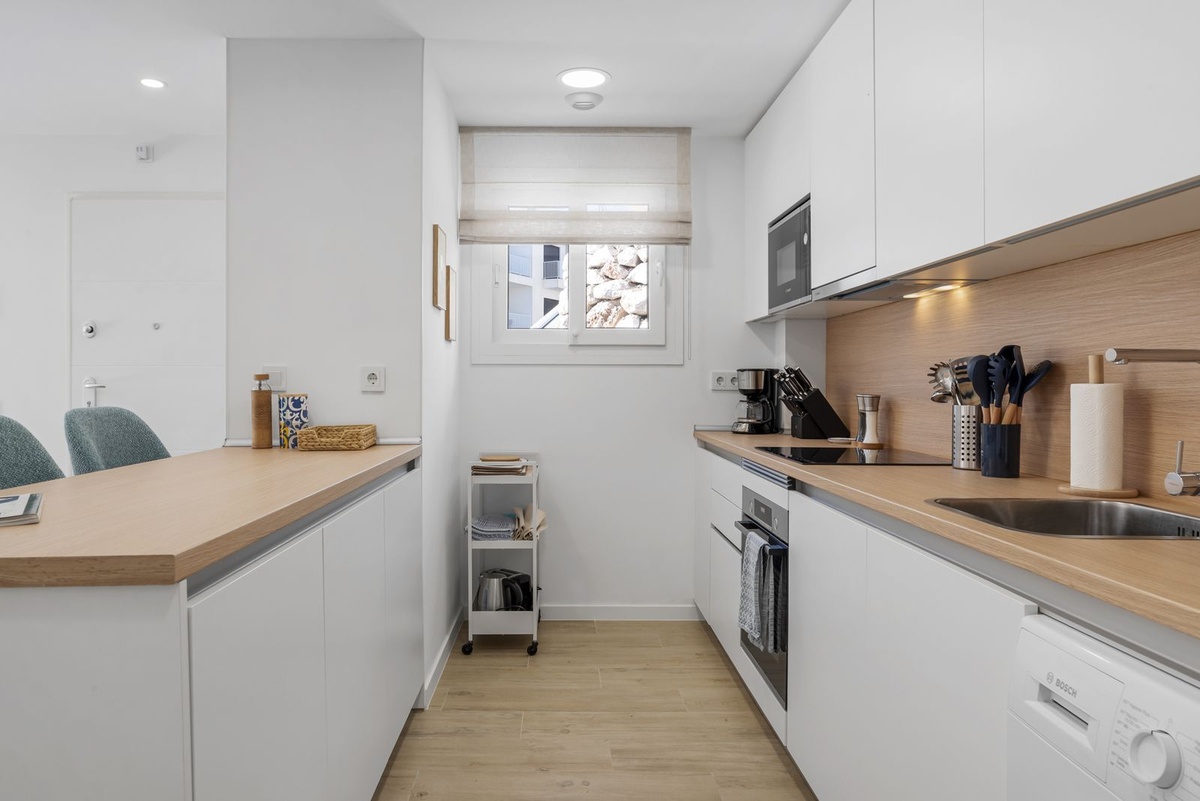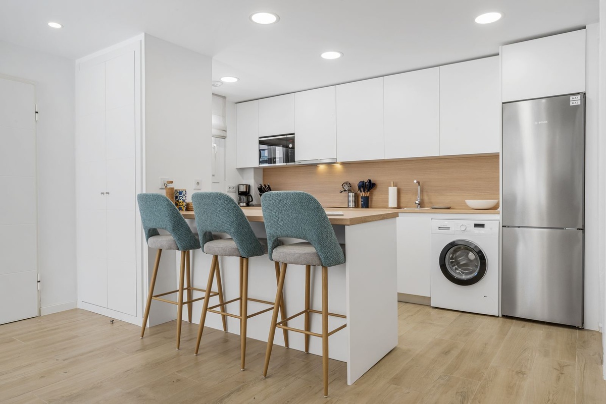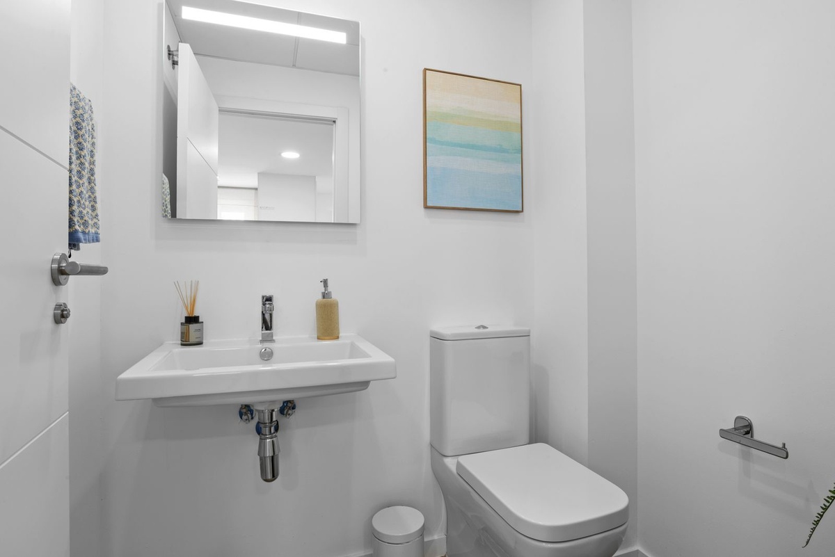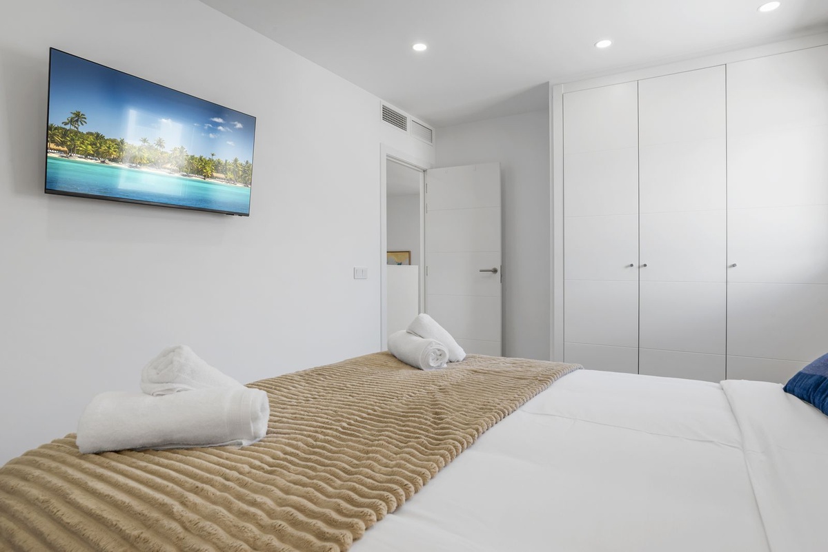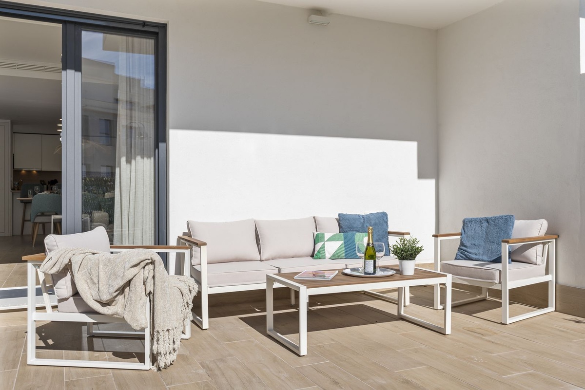 Enter the spacious open plan living area with kitchen, dining area, living room and access to the patio and private garden. The kitchen is fully equipped with all appliances, a separate utility area with washer and tumble dryer and there is a downstairs wc. Family time is spent together in this fully connected space, around the breakfast bar and dining table or on the large comfy sofa area with big screen TV or playing games, this is a welcoming and comfy space to enjoy time well spent with family or friends. Upstairs we have 3 bedrooms, the master suite with ensuite and private sea view terrace, a further spacious double bedroom and a comfortable twin room shares the family bathroom with walk in shower. All the bedrooms are light and bright with the modern coastal vibe that runs through the house