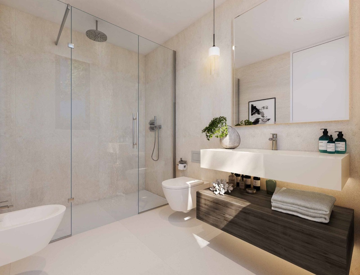 - “Gran formato” ( floor to ceiling ) ceramic wall tiles in the bathrooms.