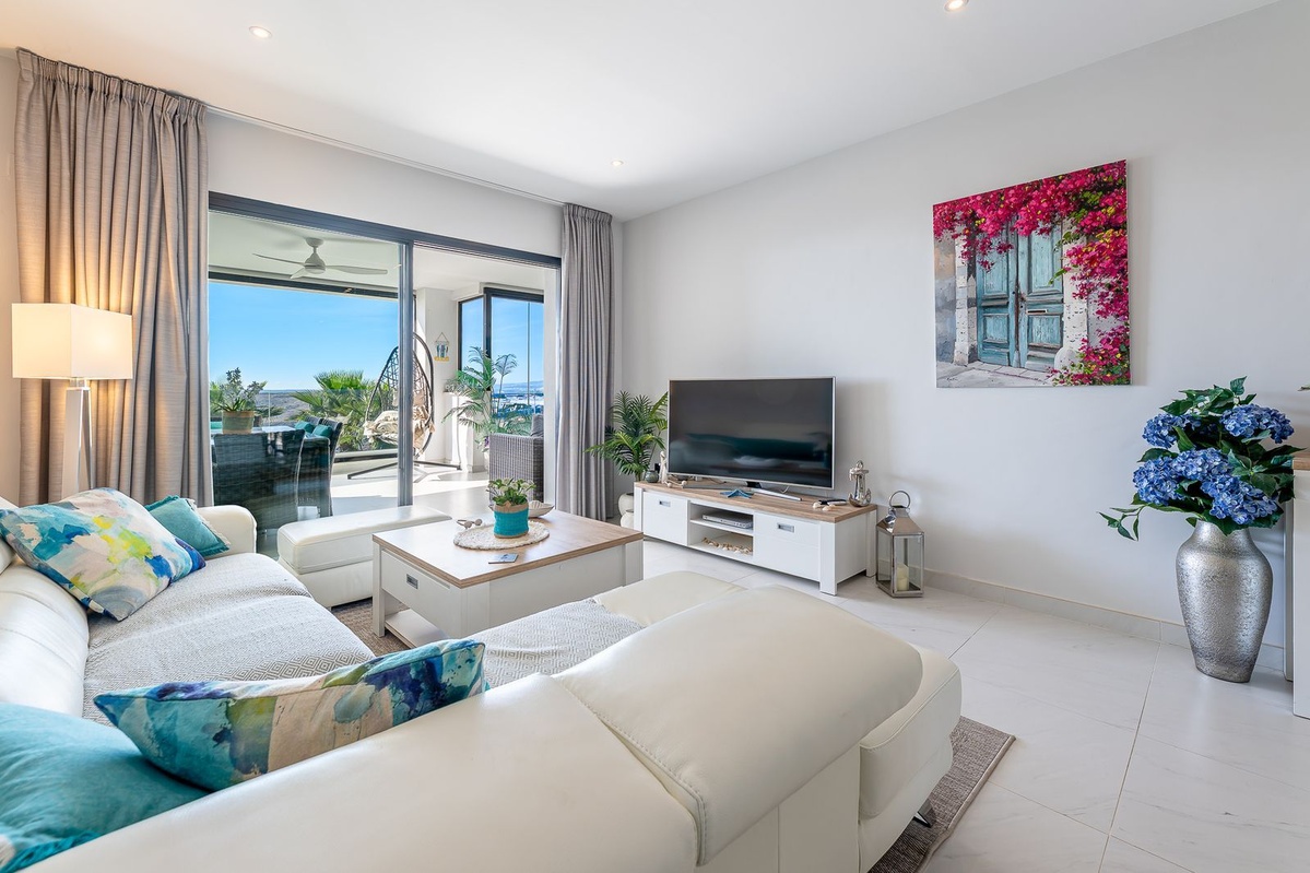 The bright and airy living/dining area opens onto a beautiful terrace with dining and lounge spaces, perfect for enjoying panoramic sea and mountain views. On clear days, you can even admire the spectacular silhouettes of Gibraltar and North Africa. With sunshine all day long, it’s ideal for year-round living: enjoy sunrises over Estepona town and unforgettable sunsets over the mountains.