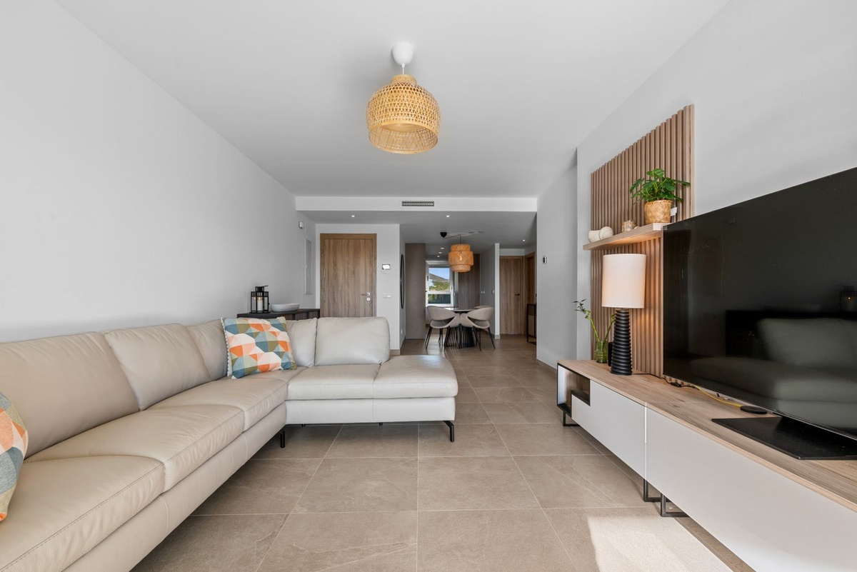 Квартира расположена на западной стороне, с прекрасным видом на поле для гольфа и общий бассейн. Светлая гостиная открытой планировки оснащена кондиционером и полностью оборудованной кухней с посудомоечной машиной, духовкой, плитой, стиральной машиной и сушилкой. Отсюда большие раздвижные двери ведут на крытую террасу и в небольшой частный сад, создавая идеальный поток внутри и снаружи для отдыха или развлечений.