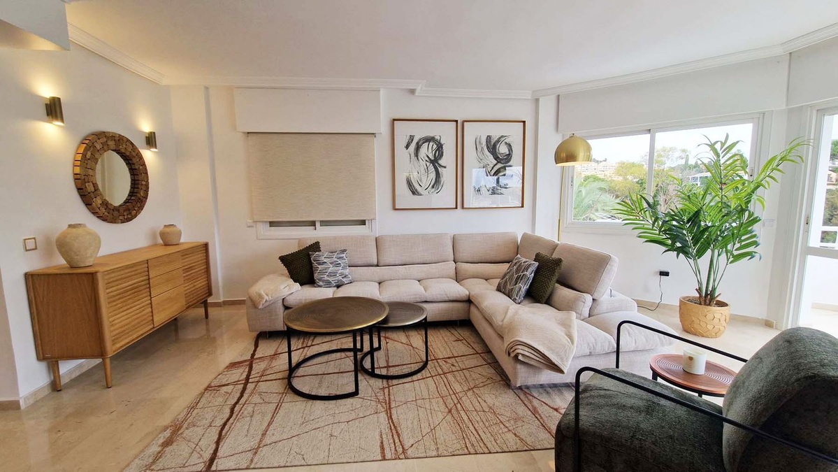 Very nice renovated 3 bed 2 bath (one in suite) penthouse for sale just 300 meters from the seafront and the beach in Benalmaadena Costa. This property has been renovated by the current owners. Electricity, plumbing, new kitchen, bathrooms completely changed also. Air conditioning system is also distributed in all the rooms. Electric shutters in all rooms. If you are looking for a property in perfect condition, this should be the one for you! Just in front of the golf course of Torrequebrada, so nothing can be constructed in front of this apartment. It enjoys very good sunshine and enjoys a very pleasant view of the golf course of Torrequebrada and the sea from the very large terrace and the roof-top. It is sold with a parking space included in the sale price. The urbanisation (secured) has two swimming pools for adults and a small swimming pool for children. Very quiet and relaxing place, secure, with two large supermarkets within 2 minutes by car, various restaurants, pharmacies, hairdresser, bazar etc... Three international colleges are present in a very close perimeter as well as hotels. Very rare quality apartment in a nice location. Sold fully furnished. Malaga airport at just 20 minutes driving distance.