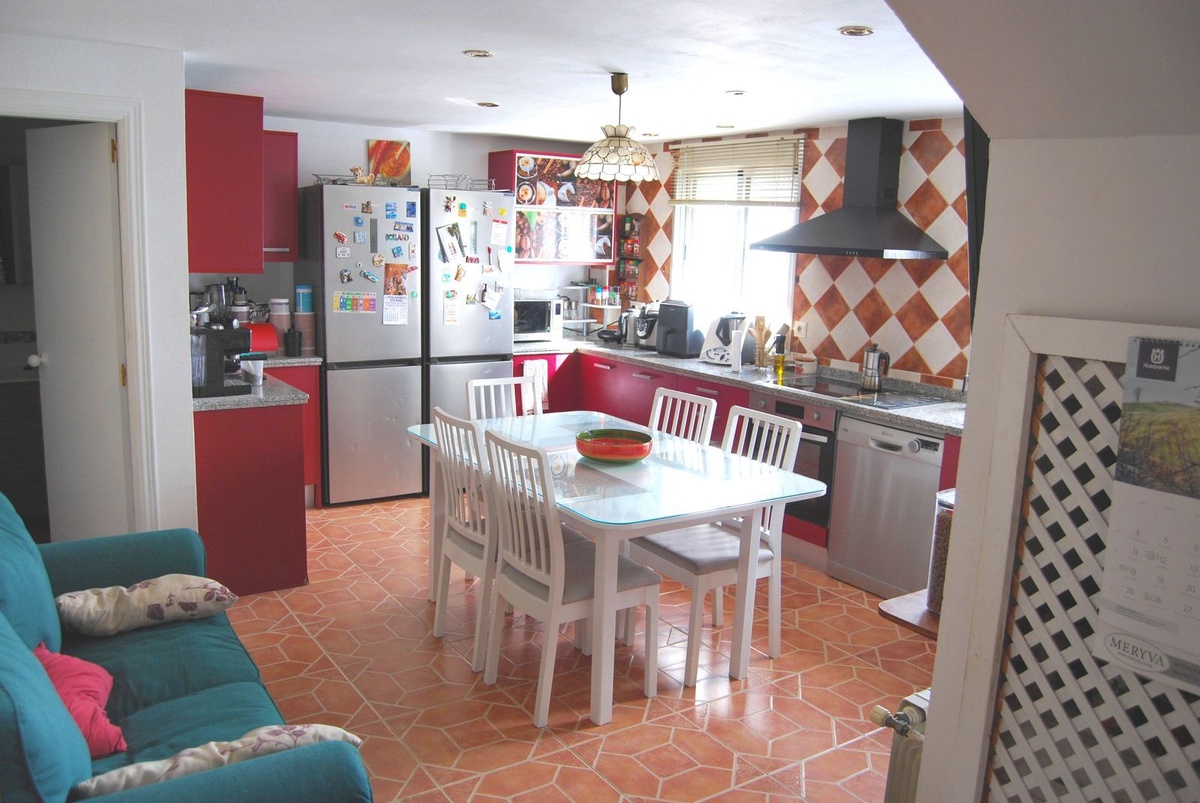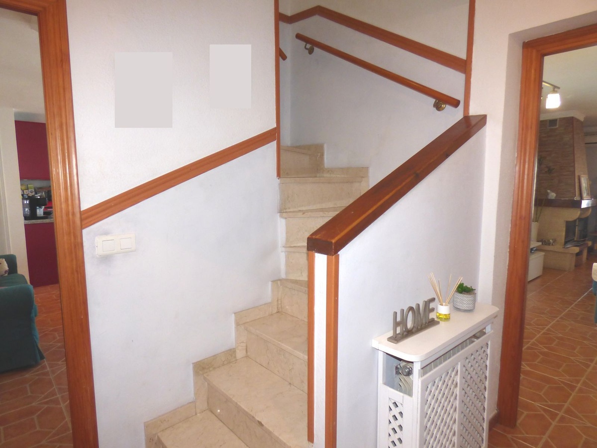 On the main floor you’ll find a spacious kitchen with room for a dining table, a guest WC, a cozy living room, an enclosed terrace currently used as an office/fourth bedroom, and access to the large open terrace.
