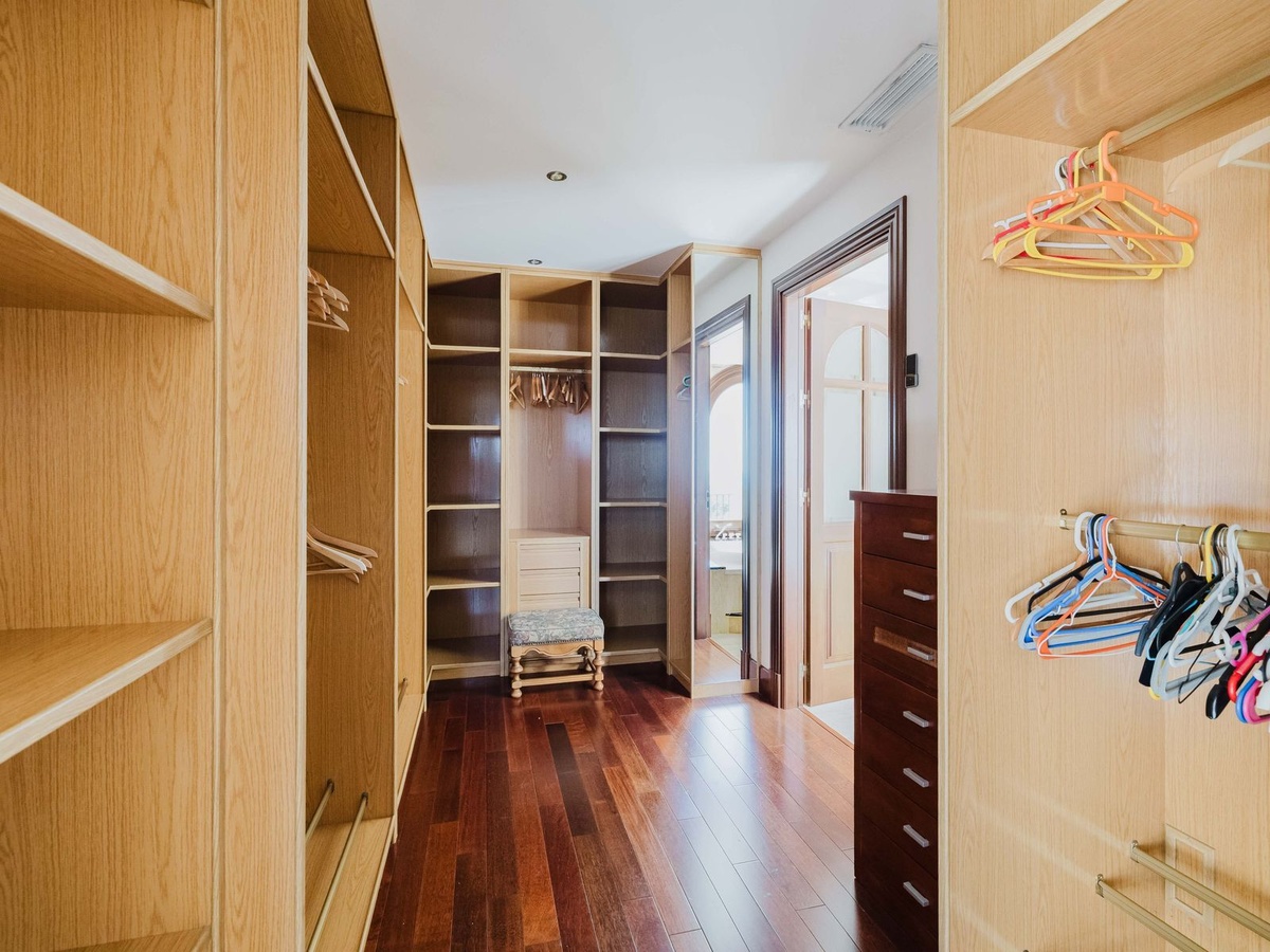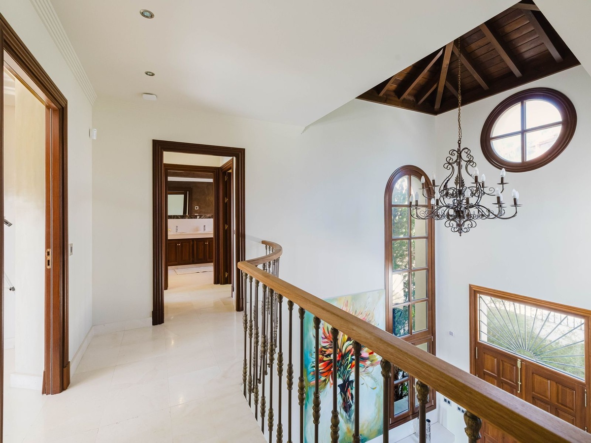 The upper floor features two spacious master suites, each with a private bathroom and walk-in closet. Both rooms are decorated with top-quality furniture and open onto a perimeter balcony that surrounds the floor, from which you can enjoy spectacular views of the sea and the natural surroundings.