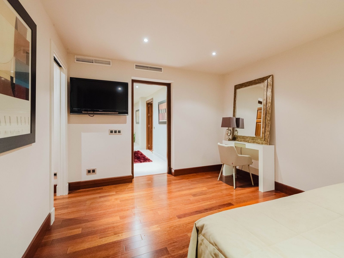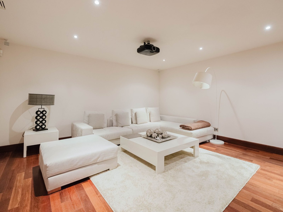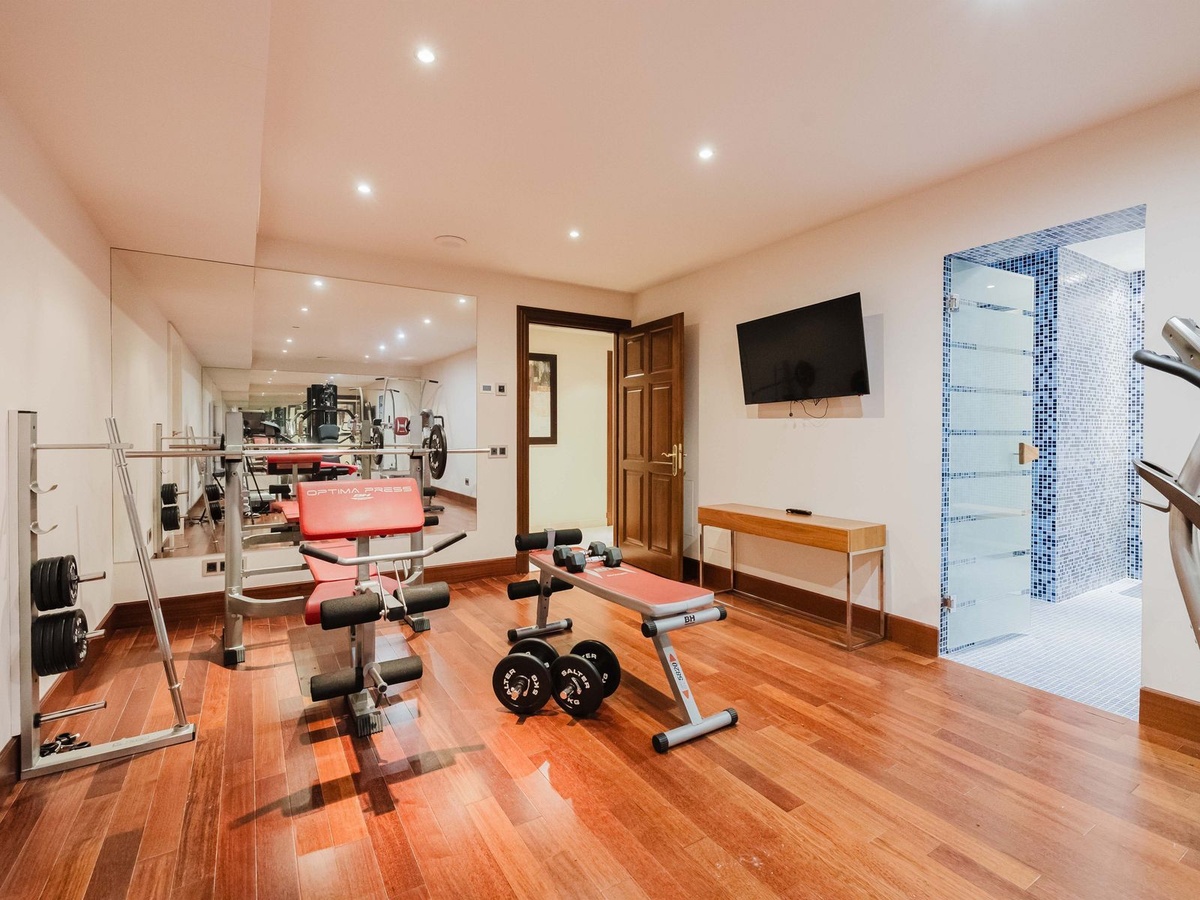 Designed for leisure, wellness, and functionality, the lower floor houses a cinema room with a projector, a fully equipped gym, sauna, wine cellar, and two spacious bedrooms with en-suite bathrooms, ideal for guests or staff. It also has a private garage with direct access to the interior of the house, with capacity for several vehicles.