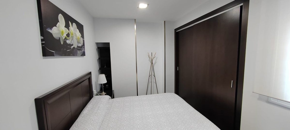 The property offers approximately 60 m², distributed into 2 bedrooms with fitted wardrobes, 2 full bathrooms with walk-in showers, and a fully equipped open-plan kitchen with breakfast bar, integrated into a bright and welcoming living-dining area.