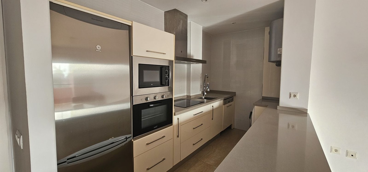 Это угловая квартира на первом этаже (без лифта), обеспечивающая дополнительную конфиденциальность и обилие естественного света. Внутри квартиры есть просторная гостиная с прямым выходом на частную террасу, идеально подходящую для отдыха или развлечений. Кухня открытой планировки была полностью отремонтирована, полностью меблирована и оснащена современной бытовой техникой, что создает стильное и функциональное жилое пространство.