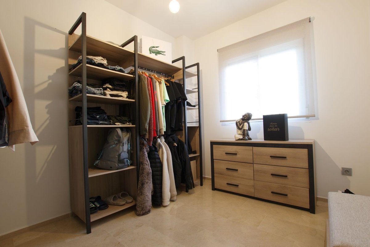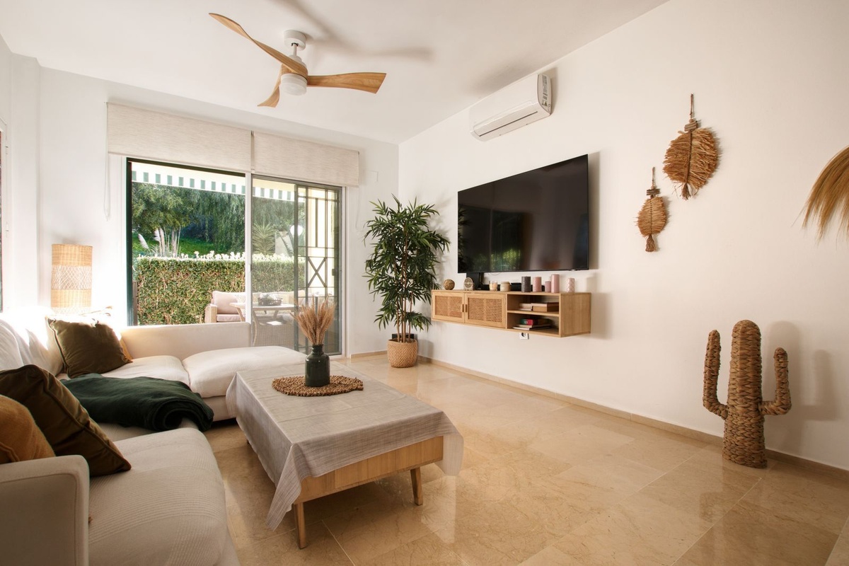 При входе слева находится кухня открытой планировки, оборудованная всей новой бытовой техникой, окном и соединенная со столовой зоной, где стоит стол и 4 стула. Далее находится просторная гостиная с L-образным диваном, кондиционером, выходом на частную крытую террасу и открытый участок частного сада. Есть две спальни с окнами и сплит-системой горячего/холодного кондиционирования. Две оригинальные ванные комнаты были объединены в одну, очень большую ванную комнату с ванной, двойным душем и большой двойной раковиной. Однако с помощью гипсокартонных перегородок можно легко создать две отдельные ванные комнаты. Из частного сада есть прямой доступ к общему саду и общему бассейну (без ступенек).