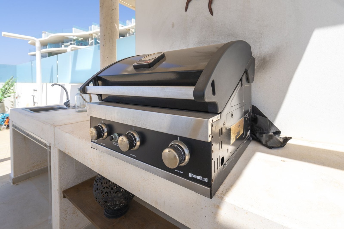 Завершенная в 2021 году, квартира отличается самой большой террасой в комплексе. Частный солярий на крыше включает в себя встроенное барбекю, джакузи и душ на открытом воздухе, создавая безмятежное уединение для наполненных солнцем дней и вечеров с друзьями.